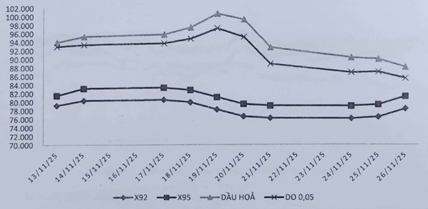 Biến động giá bán lẻ xăng dầu trong nước (26/12/2024 - 27/11/2025) - Nguồn: Liên Bộ Công Thương - Tài chính