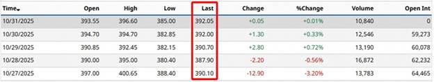 Chốt phiên giao dịch cuối tuần, giá cà phê Arabica kỳ hạn tháng 12/2025 trên sàn ICE New York chốt tại 392 cents/lb (khoảng 8.644 USD/tấn), giảm 4,4% so với tuần trước đó.