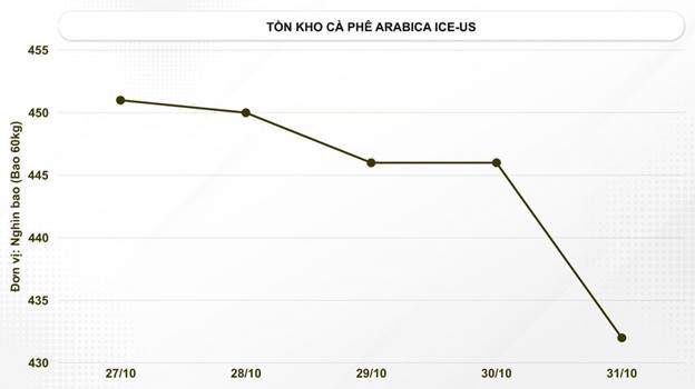 Dữ liệu tồn kho Arabica chứng nhận trên sàn ICE Futures US ngày 31/10 tiếp tục giảm mạnh chỉ còn 431.728 bao, giảm 16.045 bao so với tuần trước và đã giảm 55,94% kể từ đầu năm 2025. Đồng thời, các báo cáo về cây trồng tại Brazil xác nhận đợt nắng nóng đầu tháng 10 đã ảnh hưởng đến cây trồng do nụ hoa bị "cháy" và "rụng". Tình trạng mưa đá và gió mạnh, đã gây thiệt hại nặng nề cho bang Paraná. Các diễn biến này, kết hợp với cảnh báo về sương giá hoặc mưa đá tại các vùng quan trọng như nam Minas Gerais và São Paulo, đang làm dấy lên quan ngại lớn về sự thiếu hụt nguồn cung vụ 2026-2027 trong tương lai.