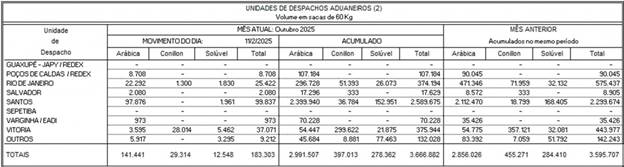 Về xuất khẩu, tính đến ngày 31/10, Brazil đã vận chuyển 3,67 triệu bao cà phê (loại 60kg). Cụ thể, lượng hàng đã xuất đi bao gồm 2,99 triệu bao cà phê Arabica, 397.013 bao cà phê Conilon, và 278.362 bao cà phê hòa tan. Các yêu cầu phát hành chứng nhận xuất xứ cho tháng 10 đạt 3,89 triệu bao, cao hơn mức 3,87 triệu bao của tháng trước. Tốc độ vận chuyển trong ngày cuối tháng 31/10 diễn ra tích cực, đạt 186.882 bao, tăng mạnh so với mức 3,48 triệu bao của ngày 30/10.