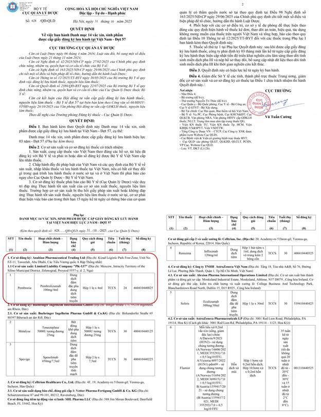Theo Quyết định số 628/QĐ-QLD ngày 31/10 do Cục Quản lý Dược, Bộ Y tế ban hành, thuốc Pembroria do Công ty Limited Liability "PK-137" (Nga) sản xuất, một cơ sở ở Các Tiểu Vương quốc Ả Rập Thống nhất đăng ký (Ô khoanh đỏ).