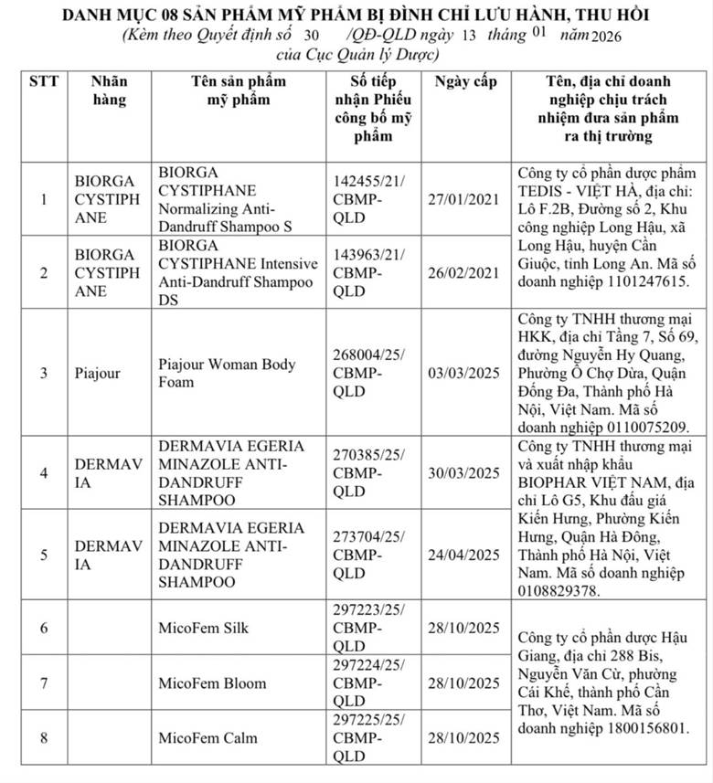 Do đó, Cục Quản lý Dược yêu cầu đình chỉ lưu hành, thu hồi toàn bộ các lô còn hạn sử dụng của 8 sản phẩm vi phạm trên phạm vi cả nước, nhằm bảo đảm tuân thủ nghiêm các quy định của Hiệp định mỹ phẩm ASEAN và nâng cao hàng rào kỹ thuật đối với mỹ phẩm lưu hành tại Việt Nam.