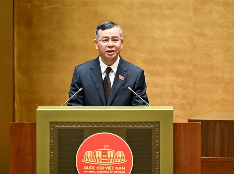 Bộ trưởng Bộ Tài chính Ngô Văn Tuấn trình bày Báo cáo tiếp thu, giải trình, chỉnh lý và hoàn thiện dự thảo Luật.
