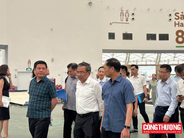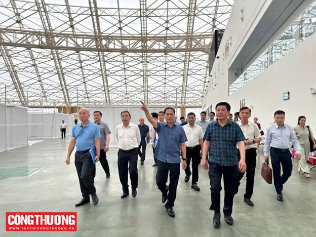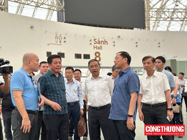 Phó Thủ tướng Bùi Thanh Sơn - Trưởng Ban chỉ đạo, Bộ trưởng Bộ Công Thương Nguyễn Hồng Diên - Phó Trưởng ban thường trực Ban chỉ đạo, Thứ trưởng Bộ Công Thương Nguyễn Sinh Nhật Tân - Phó Trưởng ban Hội chợ Mùa Thu 2025 cùng Đoàn công tác kiểm tra thực tế công tác chuẩn bị Hội chợ, chiều 19/10/2025.
