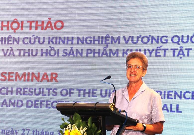 Bà Geraldine Cosh, Chuyên gia độc lập, đến từ Vương quốc Anh chia sẻ kinh nghiệm Quy định pháp luật về quản lý an toàn sản phẩm và việc thu hồi, giám sát, xử lý hàng hóa khuyết tật ở Vương quốc Anh