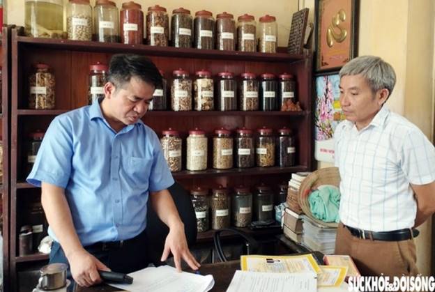 TS. Trần Minh Ngọc, Phó Cục trưởng Cục Quản lý y dược cổ truyền Việt Nam (trái), kiểm tra hoạt động của một cơ sở hành nghề y dược cổ truyền trên địa bàn tỉnh Hưng Yên.